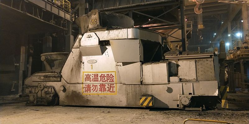 球化包軌道車采用電纜卷筒供電,電纜的一端接在地面電源上,另一端經(jīng)電動平車的鐵夾裝置引入平車。該型電動平車的特點是臺面高度較低,裝卸重物容易,但運行距離不能太長,一般不能超過100m,過長容易纏繞電纜。雖然使用距離受限,但是使用時間不受限。一般情況下,為了避免電纜磨損,會安裝拖鏈進行保護。
