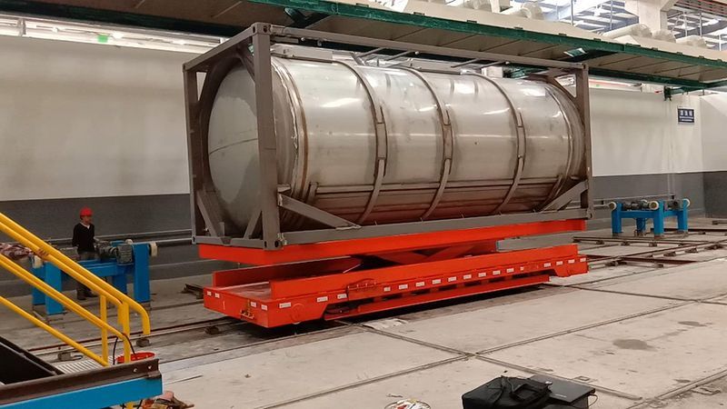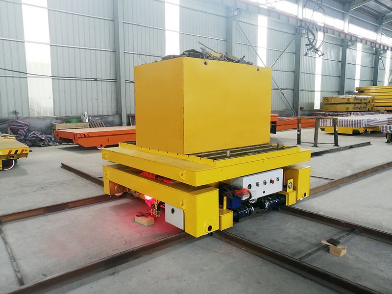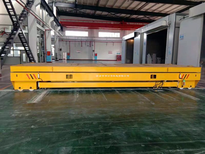 在現(xiàn)在的自動化生產(chǎn)車間,常常會見到很多的交叉軌道,這樣的交叉軌道不只是讓不同軌道上的車輛各自行走,還要求不用的軌道之間互相交換,來實(shí)現(xiàn)不同軌道上的車輛將物件運(yùn)輸?shù)浇徊孳壍赖墓ぷ魑恢蒙?,針對這種工況,百分百公司設(shè)計(jì)了十字交叉平移換軌地平車。